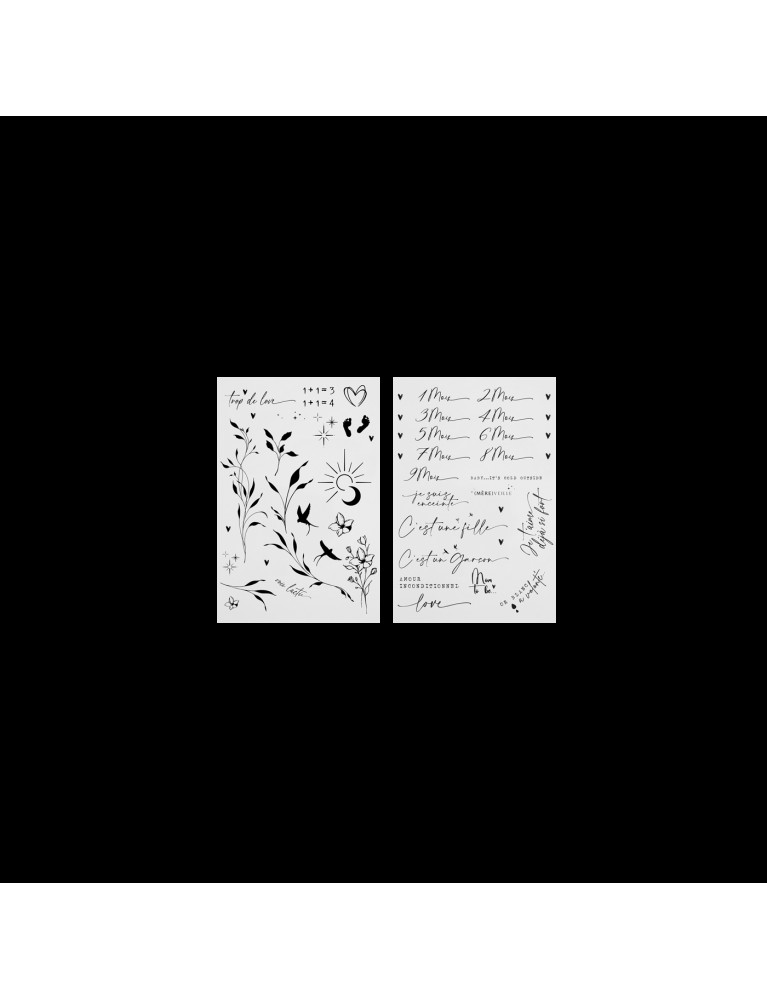 Annoncez de manière originale votre grossesse et conservez chaque étape de ces 9 mois en photos avec nos tatouages éphémères. Un ensemble de 40 tatouages composé de mots d’amour, d’annonces et de jolis motifs pour illustrer chaque étape de votre grossesse. Des bijoux de peau au design moderne et poétique pour de jolis souvenirs !